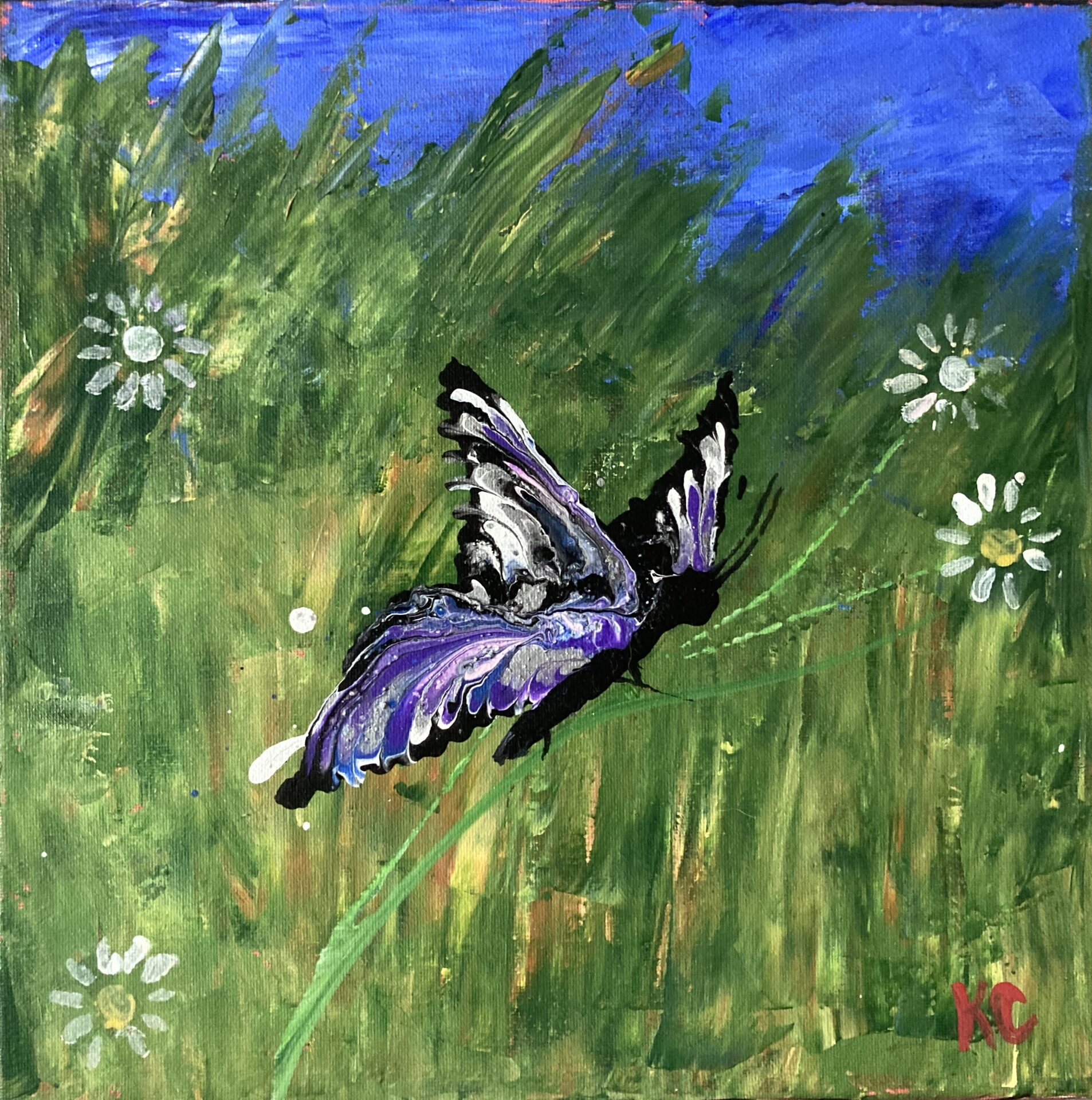 Abstract acrylic painting of a purple butterfly. 12″ x 12″ canvas.